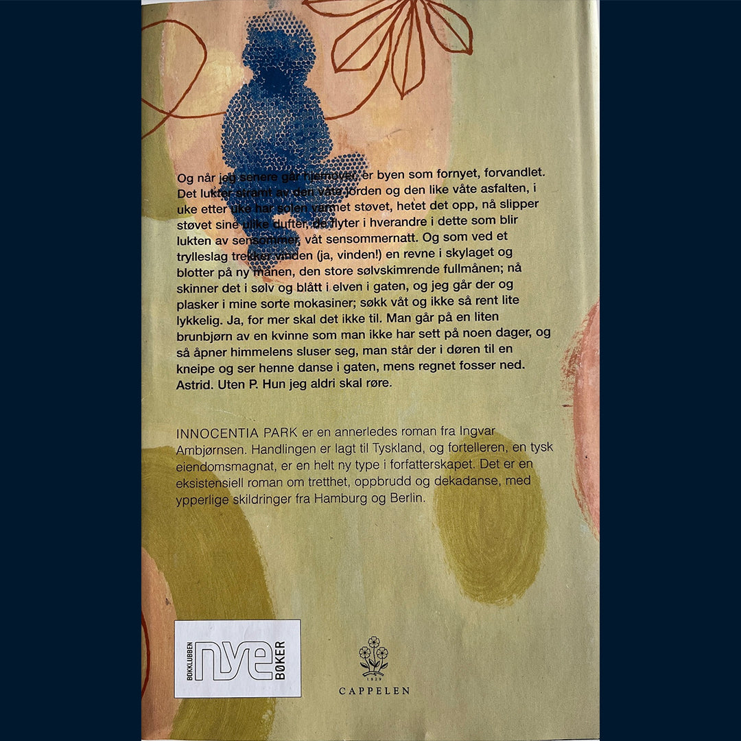 "Innocentia Park" er en annerledes roman fra Ingvar Ambjørnsen. Handlingen er lagt til Tyskland, og fortelleren, en tysk eiendomsmagnat, er en helt ny type i forfatterskapet. Det er en eksistensiell roman om tretthet, oppbrudd og dekadense, med ypperlige skildringer fra Hamburg og Berlin.