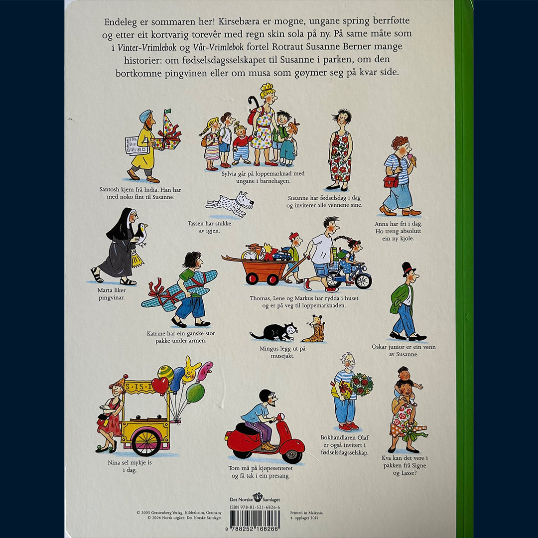 Boka viser deg ein heil by med omland, og med hus, gater og ein vrimmel av saker og ting. Bileta gøymer ei rekkje små forteljingar som handlar om kva folk og dyr opplever her ein vanleg sommardag: Om fødselsdagsselskapet til Susanne i parken, om den bortkomne pingvinen eller om musa som gøymer seg på kvar side. Alltid noe nytt å finne og snakke om.