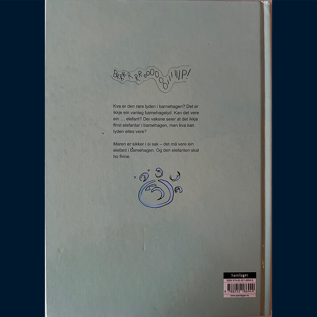 BRRRROOOOOOOIIIIIIP!!!!!! Kva er den rare lyden i barnehagen? Det er ikkje ein vanleg barnehagelyd. Kan det vere ein ... elefant? Dei vaksne seier at det ikkje finst elefantar i barnehagen, men kva kan lyden elles vere? Maren er sikker i si sak - det må vere ein elefant i barnehagen. Og den elefanten skal ho finne.