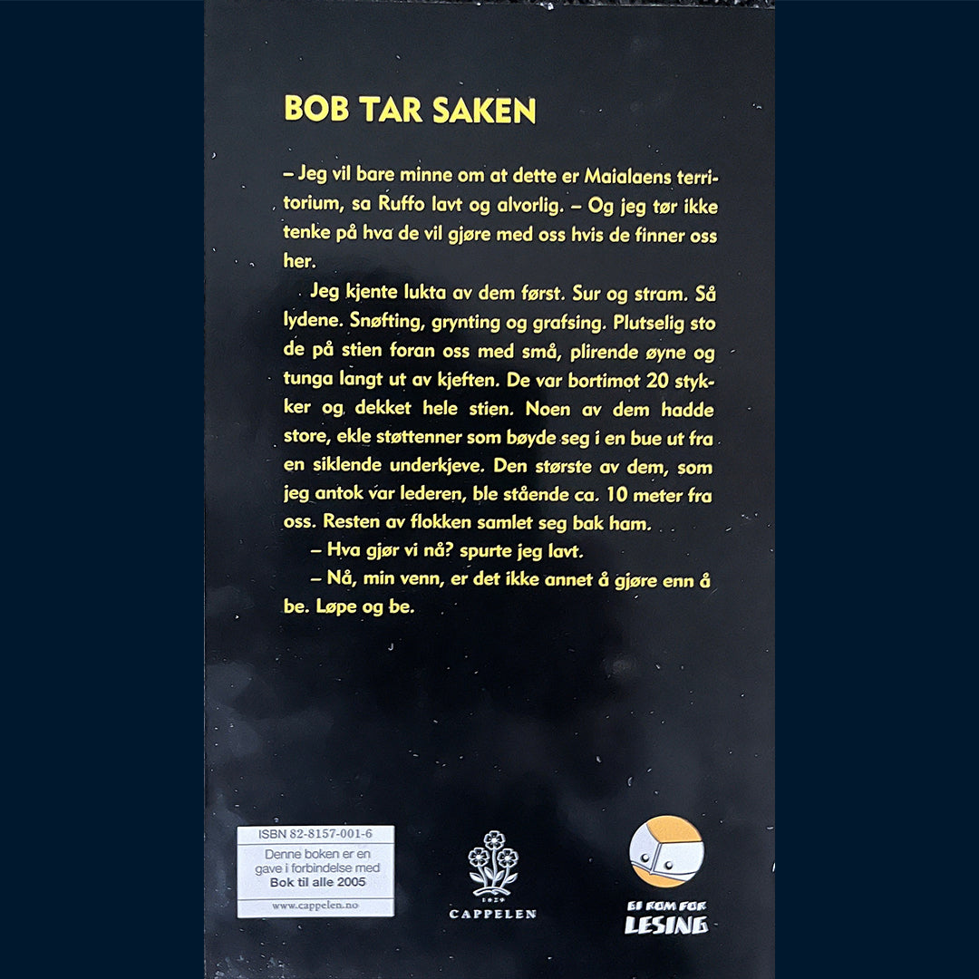Jeg kjente lukta av dem først. Sur og stram. Så lydene. Snøfting, grynting og grafsing. Plutselig sto de på stien foran oss med små, plirende øyne og tunga langt ut av kjeften. De var bortimot 20 stykker og dekket hele stien. Noen av dem hadde store, ekle støttenner som bøyde seg i en bue ut fra en siklende underkjeve. Den største av dem, som jeg antok var lederen, ble stående ca 10 meter fra oss. Resten av flokken samlet seg bak ham.