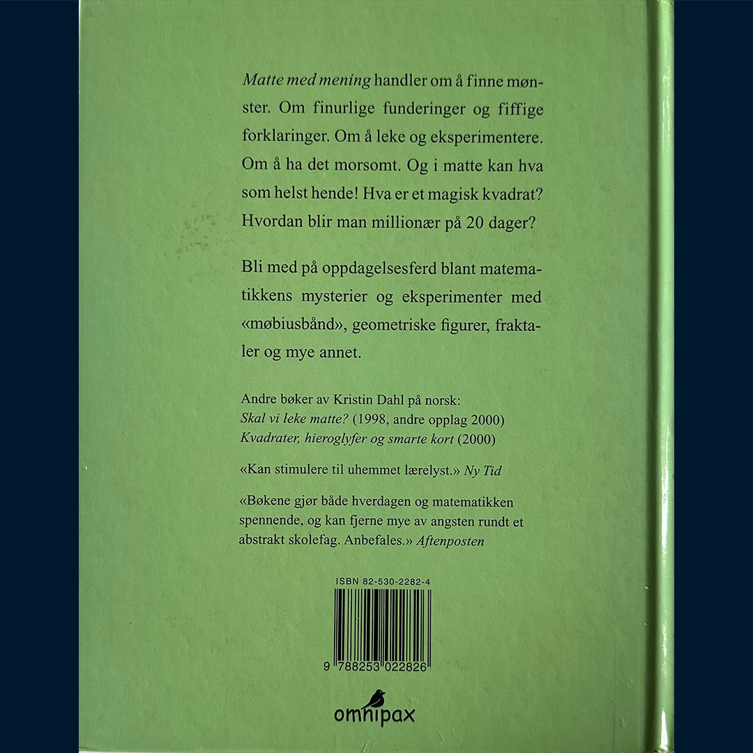 Matte med mening handler om å finne mønster. Om finurlige funderinger og fiffige forklaringer. Om å leke og eksperimentere. Om å ha det morsomt. Og i matte kan hva som helst hende! Hva er et magisk kvadrat? Hvordan blir man millionær på 20 dager?