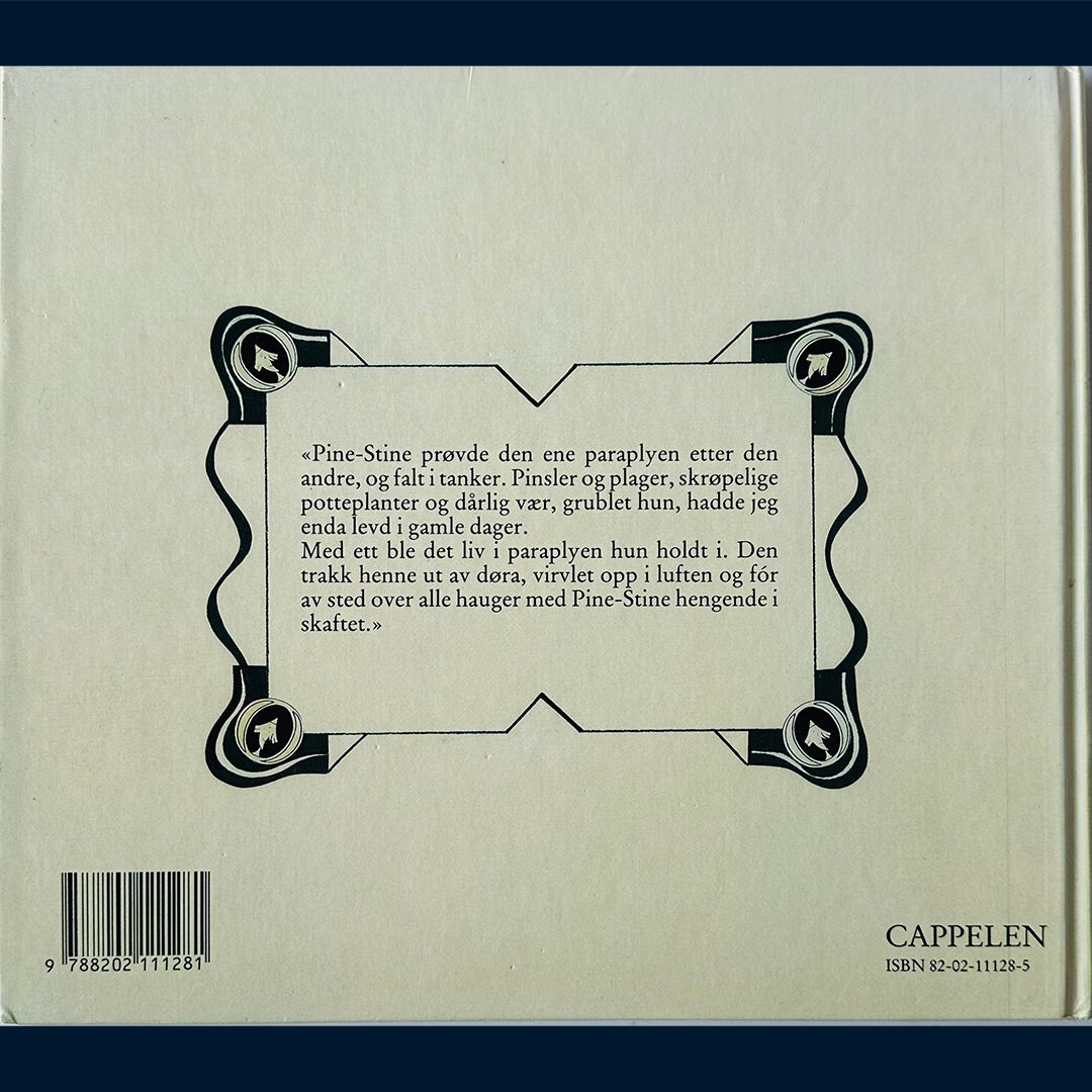 Pine-Stine prøvde den ene paraplyen etter den andre, og falt i tanker. Pinsler og plager, skrøpelige potteplanter og dårlig vær, grublet hun. Hadde jeg enda levd i gamle dager. Med ett ble det liv i paraplyen hun holdt i. Den trakk henne ut av døra, virvlet opp i luften og for av sted over alle hauger med Pine-Stine hengende i skaftet..