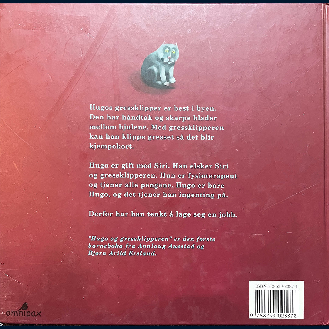Hugos gressklipper er best i byen. Den har håndtak og skarpe blader mellom hjulene. Med gressklipperen kan han klippe gresset så det blir kjempekort. Hugo er gift med Siri. Han elsker Siri og gressklipperen. Hun er fysioterapeut og tjener alle pengene. Hugo er bare Hugo, og det tjener han ingenting på. Derfor har han tenkt å lage seg en jobb. Dette er den første boken om Hugo.