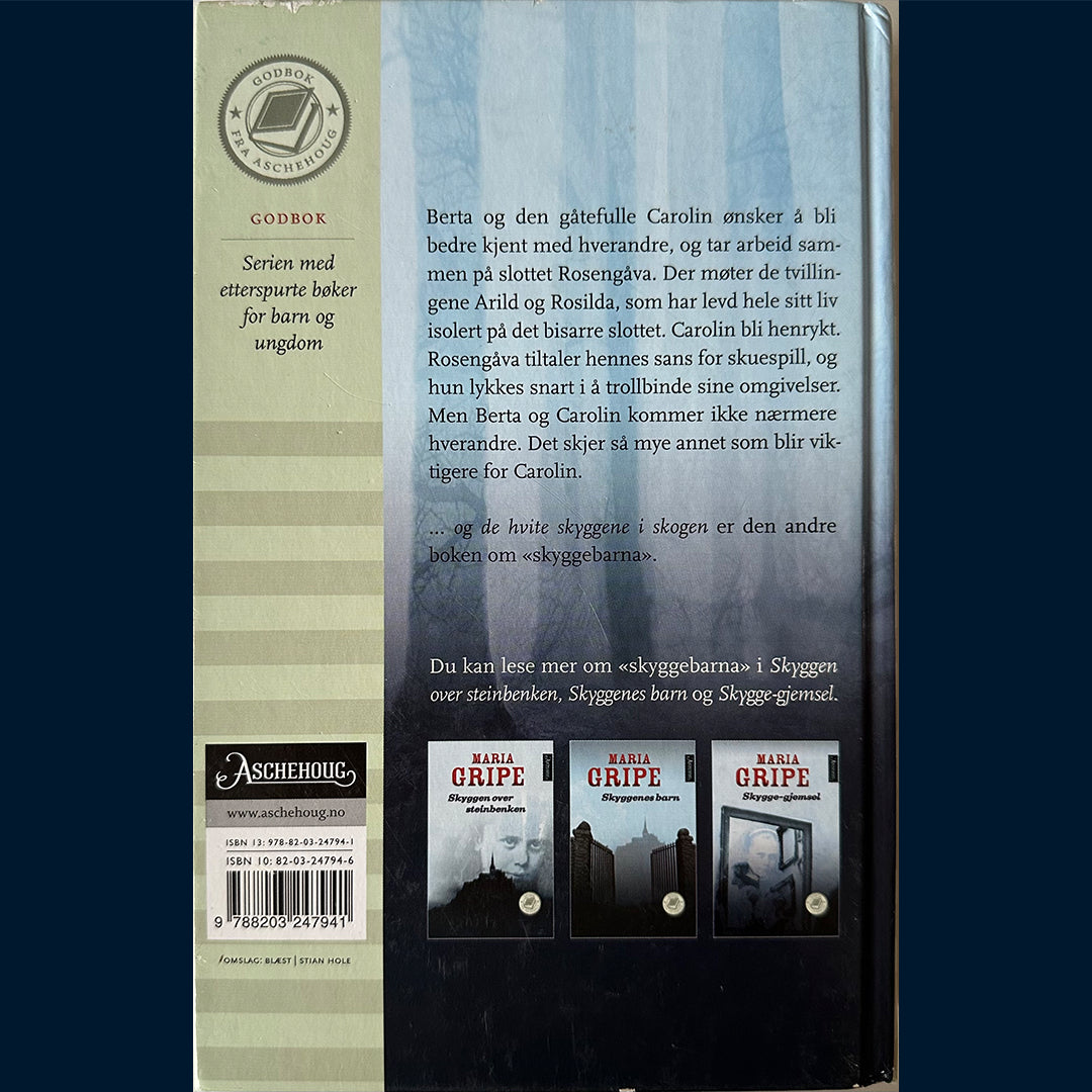 "... og de hvite skyggene i skogen" er den andre boken om "skyggebarna". Berta og Carolin skal arbeide sammen på slottet Rosengåva. Der møter de tvillingene Arild og Rosilda, som har levd isolert på det merkelige slottet hele sitt liv. Hemmeligheter fra fortiden kaster lange skygger over slottets eføykledte murer.