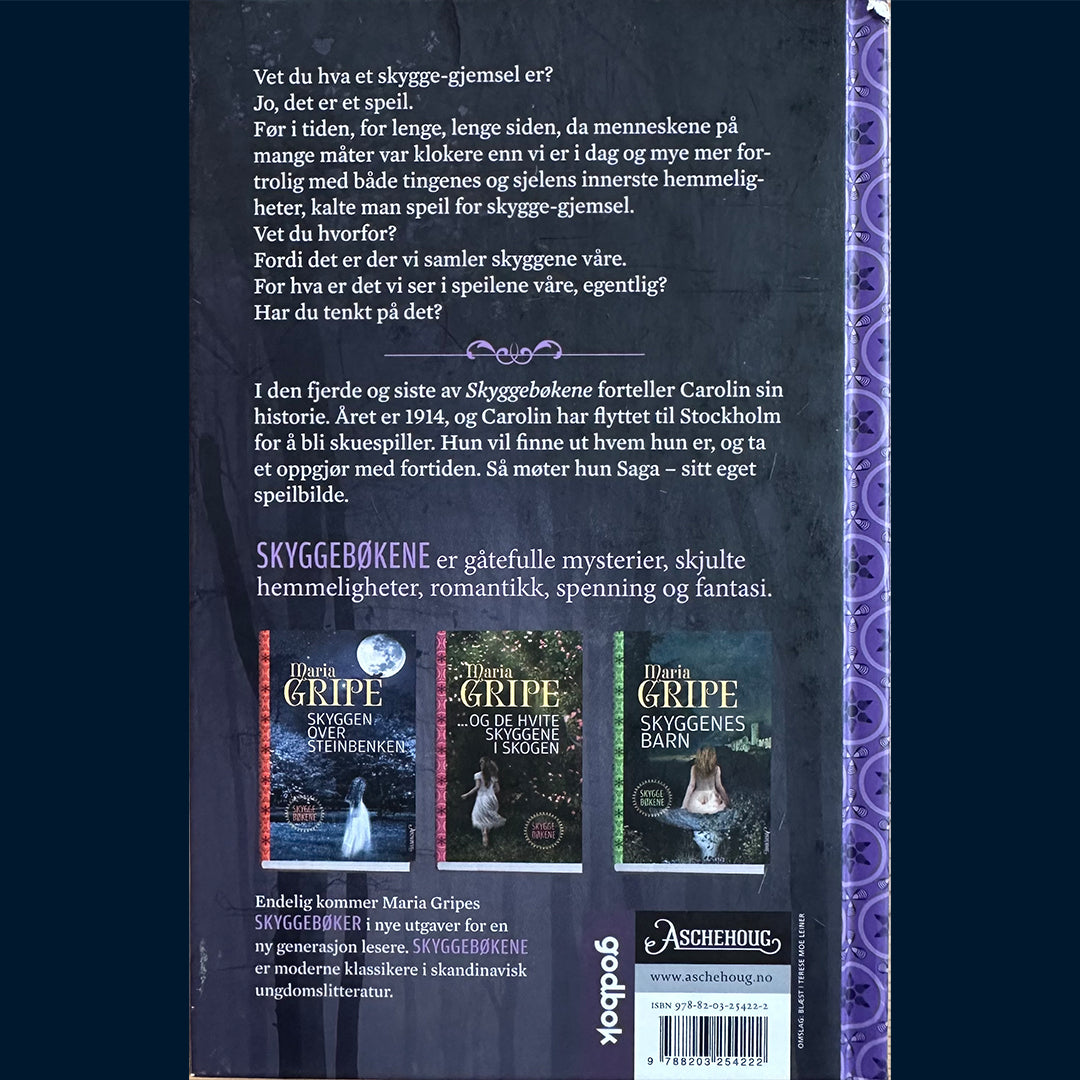I den fjerde og siste av Maria Gripes Skyggebøker forteller Carolin sin historie. Året er 1914, og Carolin har flyttet til Stockholm for å bli skuespiller. Hun vil finne ut hvem hun er og ta et oppgjør med fortiden. Så møter hun Saga - sitt eget speilbilde.