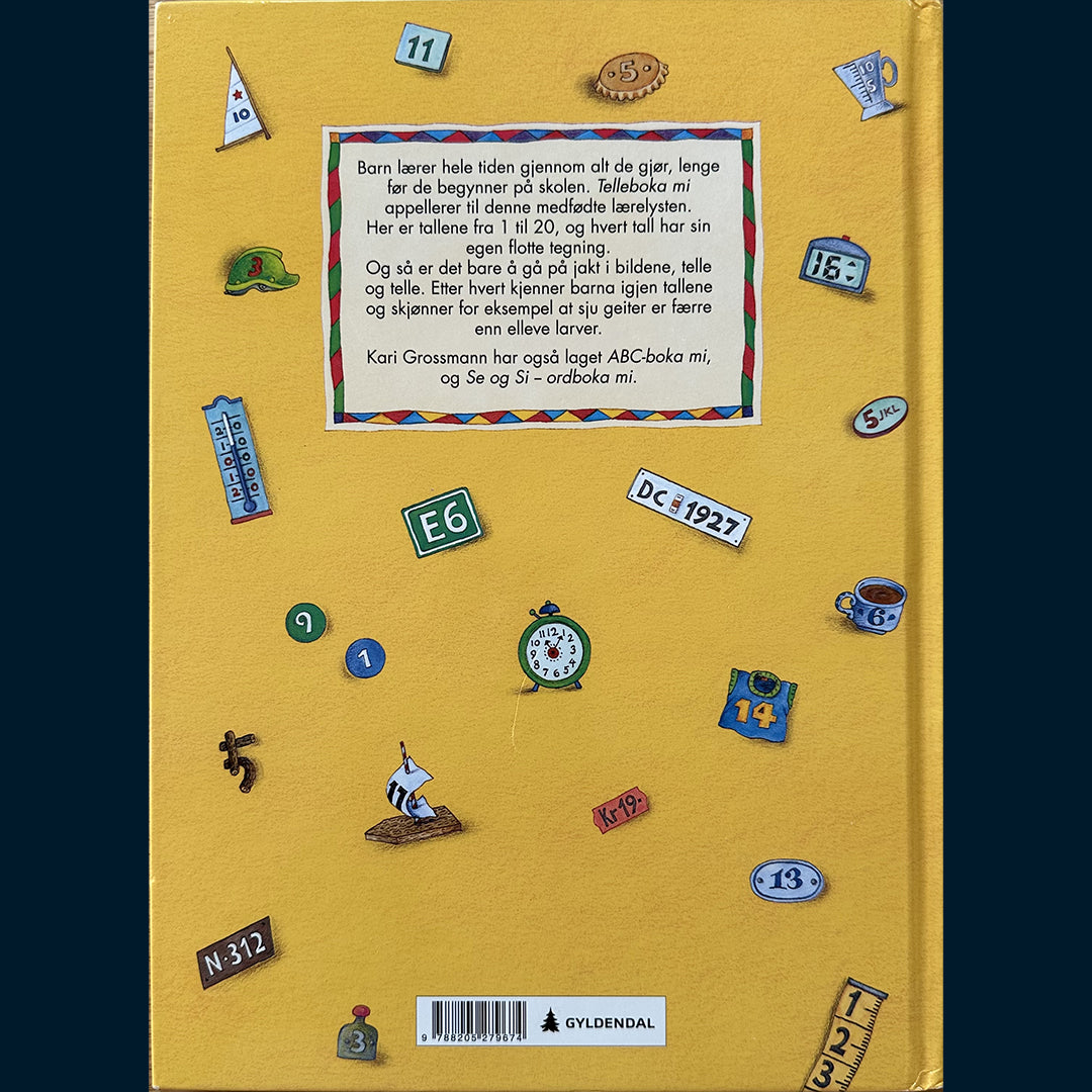 I Telleboka mi lærer barna å telle opp til 20, samt hvordan tallene ser ut. Hvert tall har en eller to hele sider, et lite tøyserim knyttet til handlingen i bildet, og en masse gjenstander man kan plukke ut og telle. Spennende leke og lærebok for førskole og småskole-barn. I samme serie: ABC boka mi.