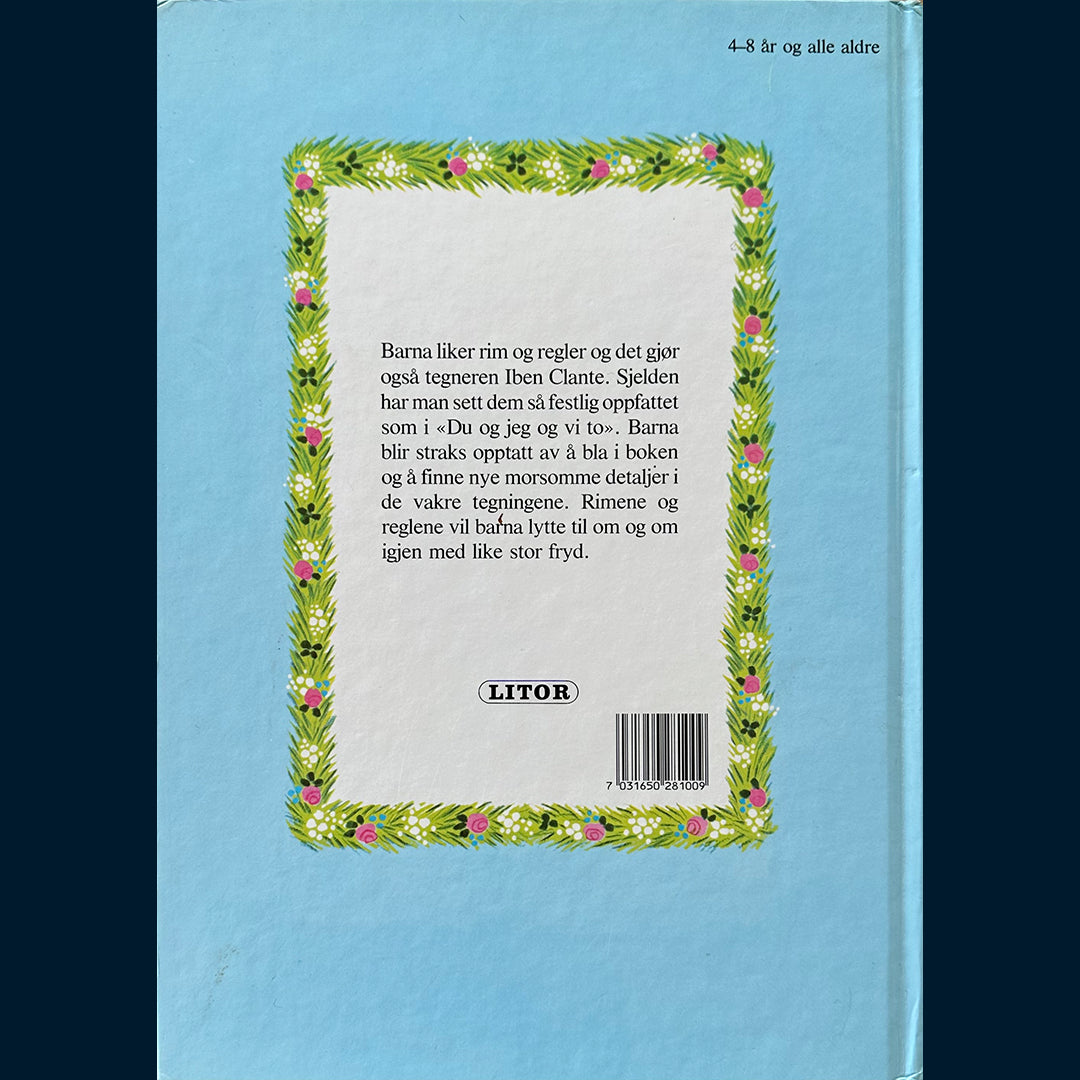 Barna liker rim og regler, og det gjør også tegneren Iben Clante. Sjelden har man sett dem så festlig oppfattet som i "Du og jeg og vi to". Barna blir straks opptatt av å bla i boken og å finne nye morsomme detaljer i de vakre tegningene.