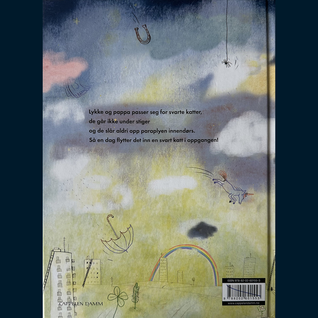Lykke og pappa passer seg for svarte katter, de går ikke under stiger og de slår aldri opp paraplyen innendørs. Så en dag flytter det inn en katt i oppgangen: Det blir for mye for pappa, og når Lykke våkner neste morgen, er pappa borte.
