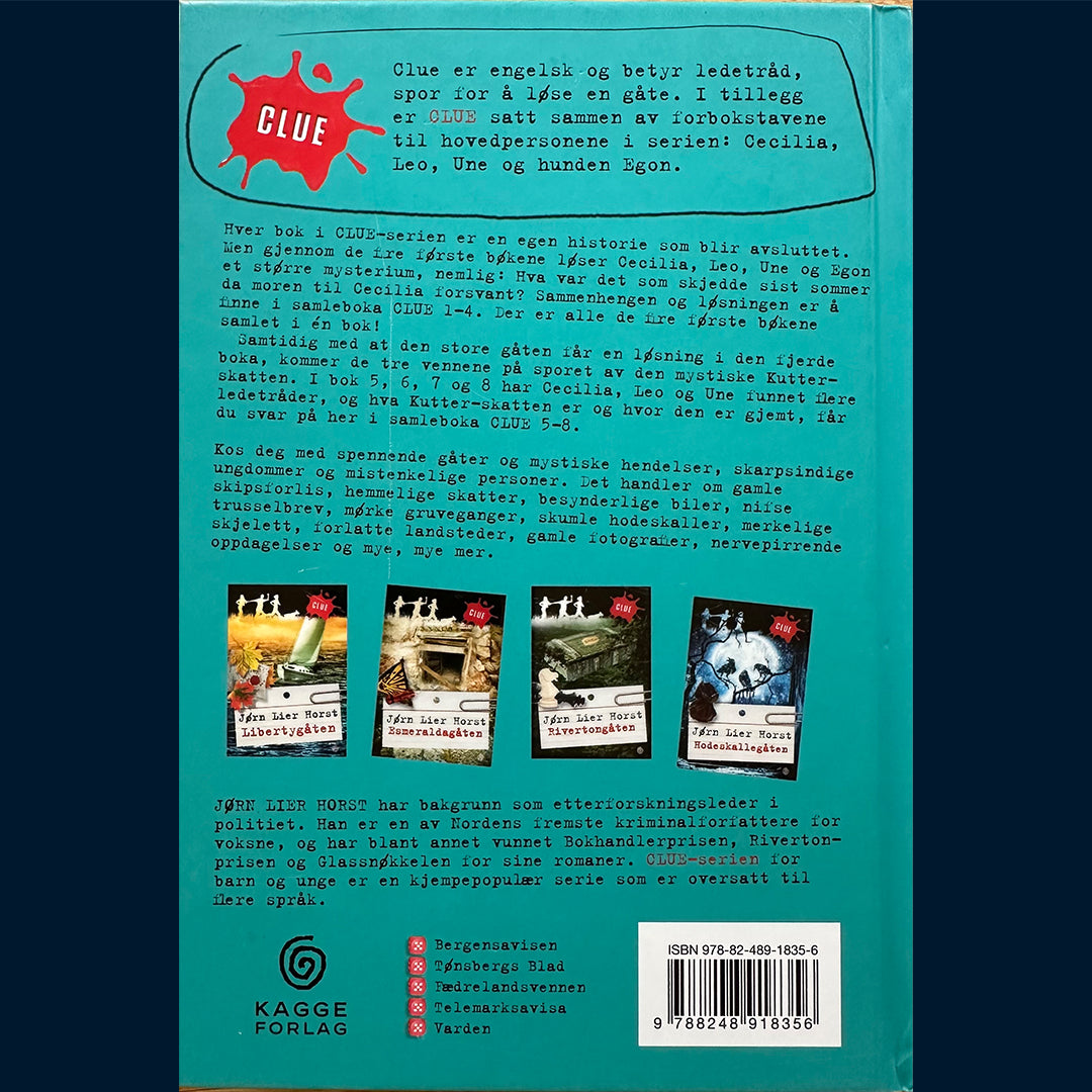Hver bok i CLUE-serien er en egen historie som blir avsluttet. Men gjennom de fire første bøkene løser Cecilia, Leo, Une og Egon et større mysterium, nemlig: Hva var det som skjedde sist sommer da moren til Cecilia forsvant? Sammenhengen og løsningen er å finne i samleboka CLUE 1-4. Samtidig med at den store gåten får en løsning i den fjerde boka, kommer de tre vennene på sporet av den mystiske Kutter-skatten. I bok 5, 6, 7 og 8 har Cecilia, Leo og Une funnet flere ledetråder, og hva Kutter-skatten er og hvor den er gjemt, får du svar på her i samleboka CLUE 5-8.