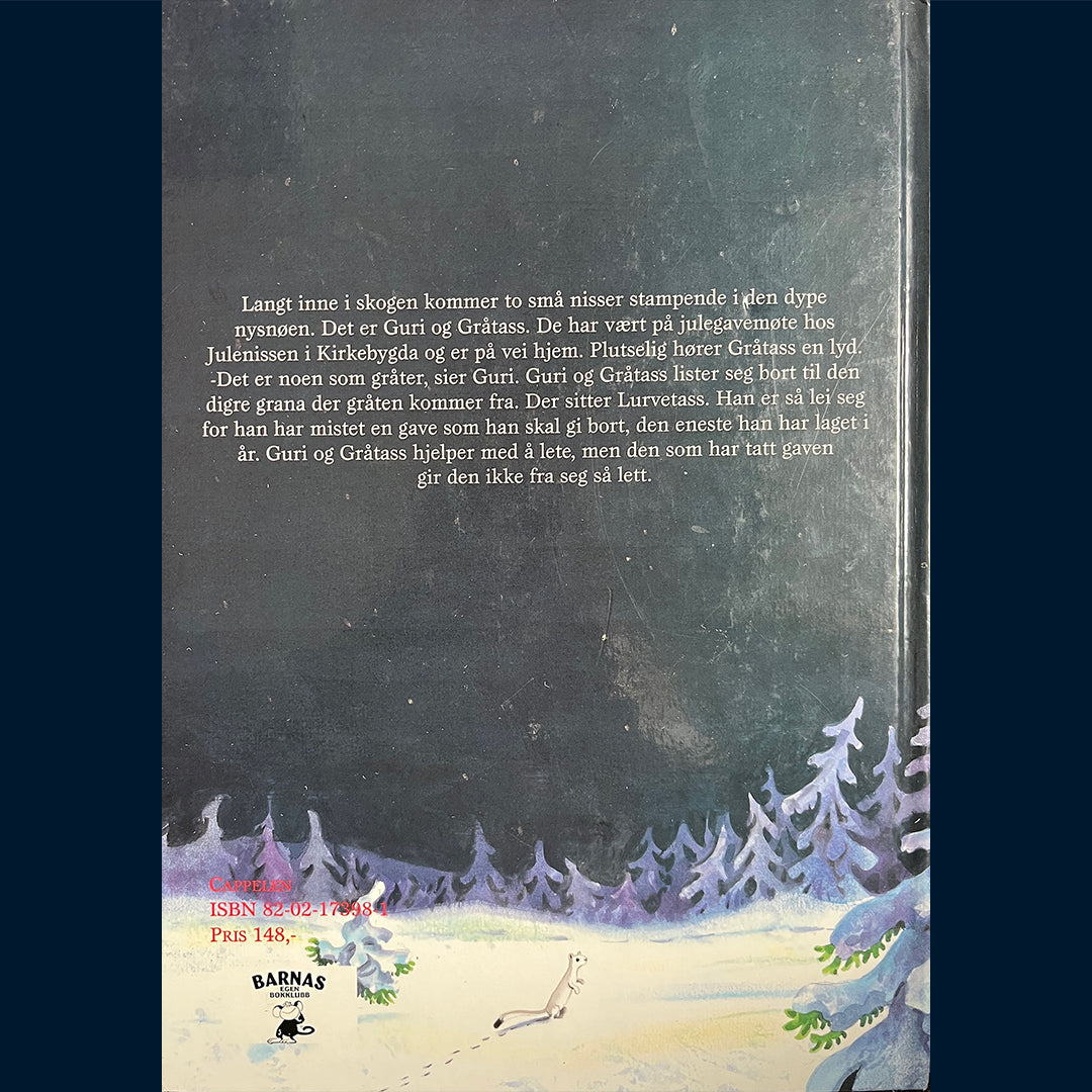 De to små nissene Guri og Gråtass er på vei hjem fra julegavemøte da de hører noen som gråter. Det er Lurveskjegg. Han har laget en magisk julegave, som han gleder seg til å gi bort. Men nå er gaven borte. Guri og Gråtass og Nissefar og Nissemor blir med for å lete, men de finner ikke gaven. Den som har tatt den, gir den ikke så lett fra seg. Men alt løser seg til slutt, og det blir en eventyrlig julaften.