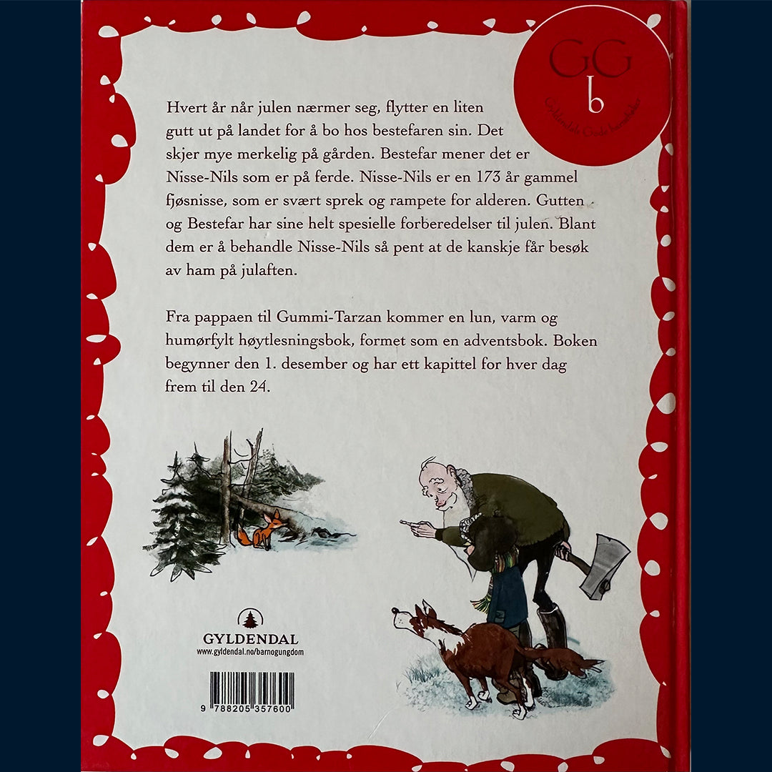 Adventsbok fra pappaen til Gummi-Tarzan! En lun, varm og humørfylt høytlesningsbok, formet som en adventsbok. Boken begynner den 1. desember og har ett kapittel for hver dag frem til den 24. Hvert år når julen nærmer seg, flytter en liten gutt ut på landet for å bo hos bestefaren sin. Det skjer mye merkelig på gården. Bestefar mener det er Nisse-Nils som er på ferde. Nisse-Nils er en 173 år gammel fjøsnisse, som er svært sprek og rampete for alderen. Gutten og Bestefar har sine helt spesielle forberedelser til julen. Blant dem er å behandle Nisse-Nils så pent at de kanskje får besøk av ham på julaften.