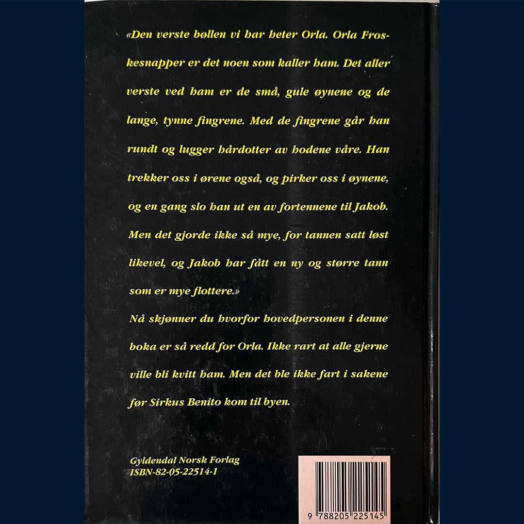 Den verste bøllen vi har, heter Orla. Orla Froskesnapper er det noen som kaller ham. Det aller verste ved ham er de små, gule øynene og de lange, tynne fingrene. Med de fingrene går han rundt og lugger hårdotter av hodene våre. Han trekker oss i ørene også, og pirker oss i øynene, og en gang slo han ut en av fortennene til Jakob. Men det gjorde ikke så mye, for tannen satt løst likevel, og Jakob har fått en ny og større tann som er mye flottere. Nå skjønner du hvorfor hovedpersonen i denne boka er så redd for Orla. Ikke rart at alle gjerne ville bli kvitt ham. Men det ble ikke fart i sakene før Sirkus Benito kom til byen.