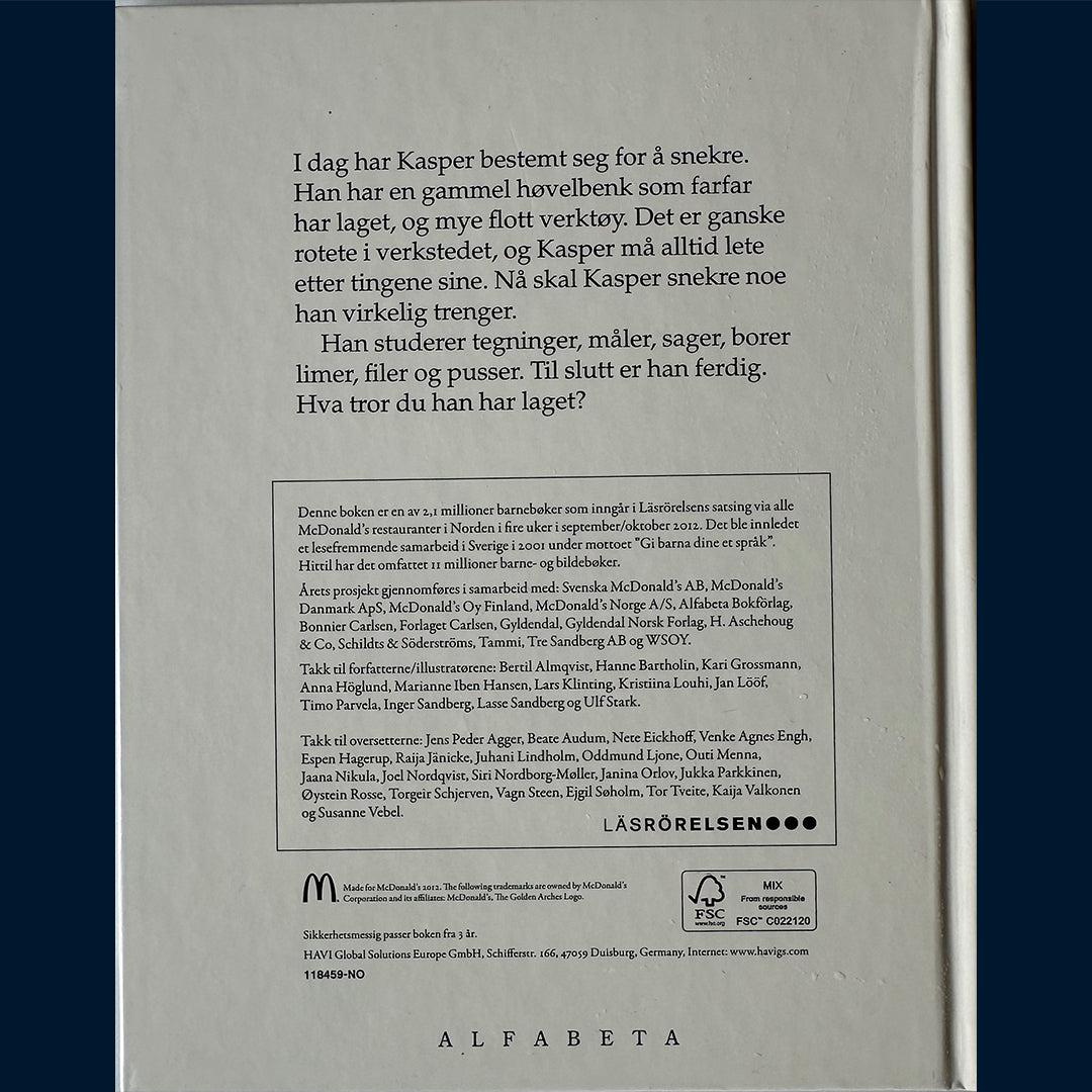 Kasper er en kjekk liten bever med mye verktøy og stort pågangsmot. Det er ganske rotete i verkstedet hans, og Kasper må alltid lete etter tingene sine. Da får han en god idé. Kasper studerer tegninger, måler, sager, borer, limer, filer og pusser. Til slutt har han laget noe riktig smart.
