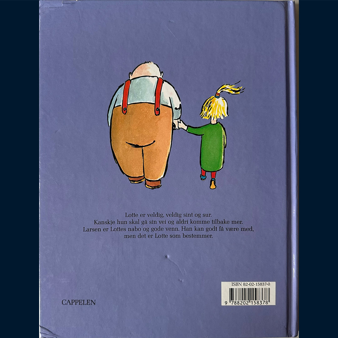 Bildebok. Lotte er veldig, veldig sint og sur. Bare fordi hun er liten får hun ikke bestemme noen ting. Ikke får hun ha hest heller. Derfor har Lotte bestemt seg for å gå sin vei, kanskje kommer hun aldri tilbake. Larsen er Lottes nabo og gode venn. Han kan godt få være med, men det er Lotte som bestemmer.