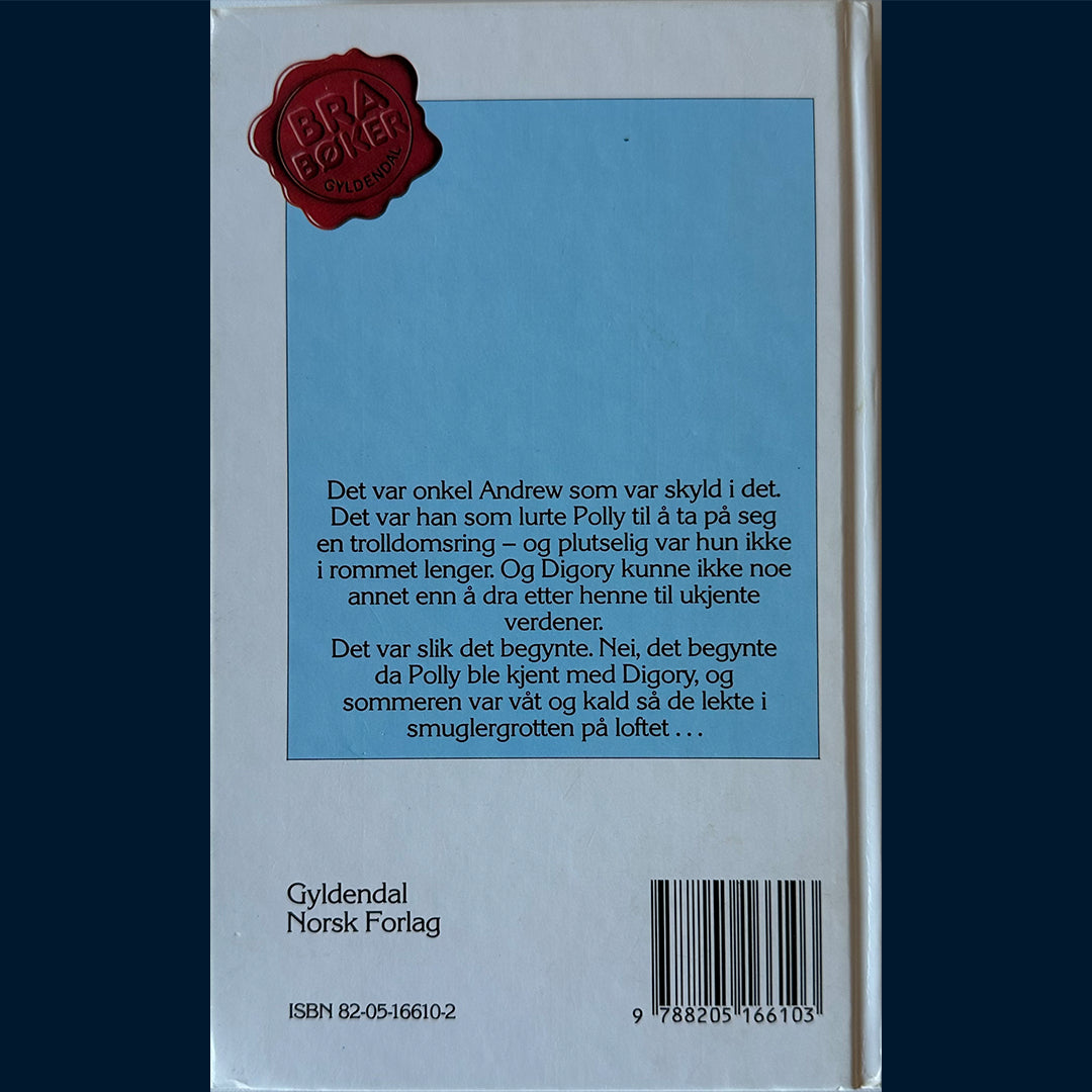 Det var onkel Andrew som lurte Polly til å ta på seg en trolldomsring - og plutselig var hun ikke i rommet lenger. Digory kunne ikke annet enn å dra etter henne. Sammen fikk de oppleve hvordan et fantastisk rike ble til: Landet Narnia.