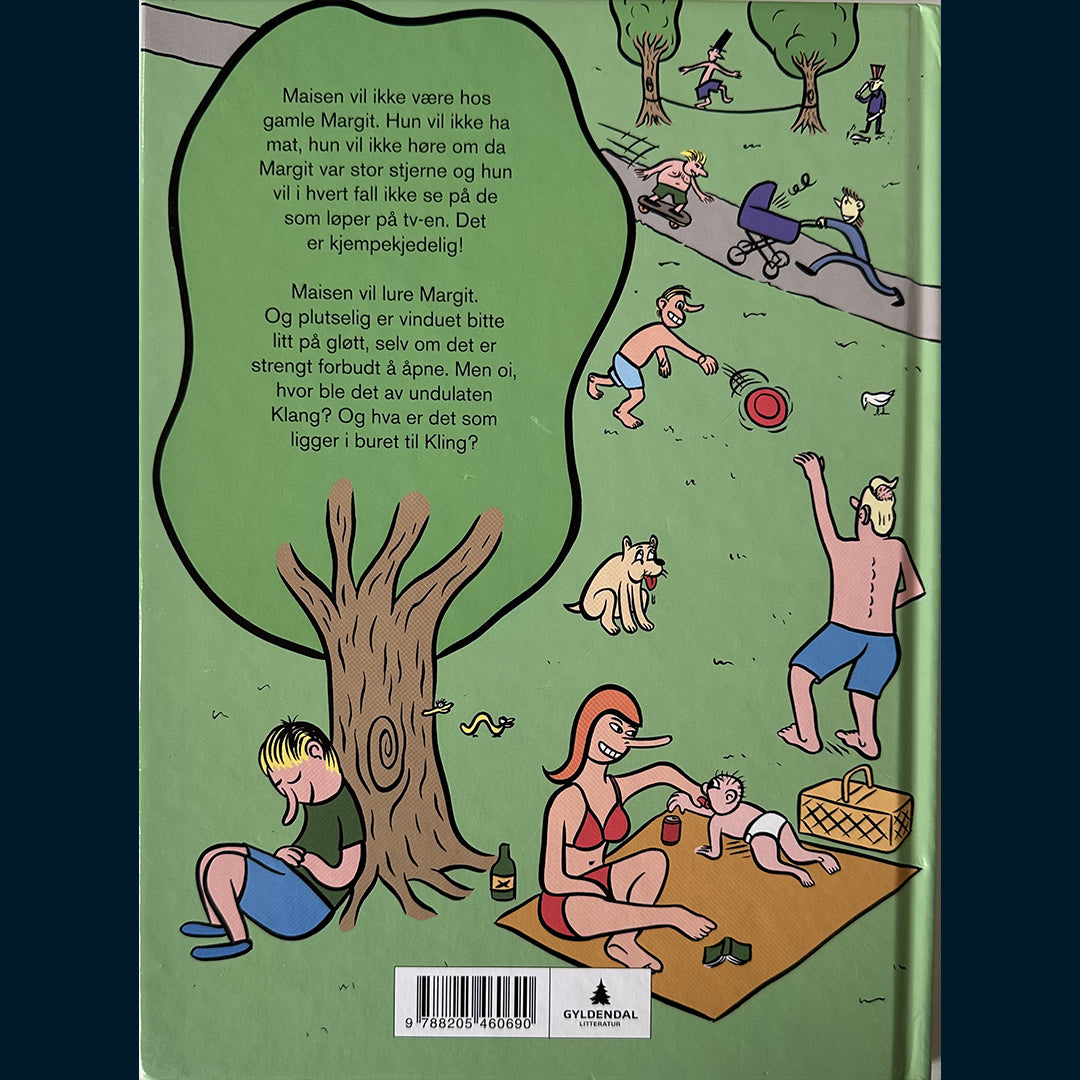 Vil ikke, vil ikke, VIL IKKE! Maisen vil ikke være hos gamle Margit. Hun vil ikke ha mat, hun vil ikke høre om da Margit var stor stjerne og hun vil i hvert fall ikke se på de som løper på TV-en. Det er kjempekjedelig! Maisen vil lure Margit. Og plutselig er vinduet bitte litt på gløtt, selv om det er strengt forbudt å åpne. Men oi, hvor ble det av Klang? Den er ikke i buret sammen med Kling!En bok om å ville ha oppmerksomhet - og om den dårlige samvittigheten man kan få etter å ha gjort noe skikkelig dumt. Selv om det egentlig ikke var med vilje!