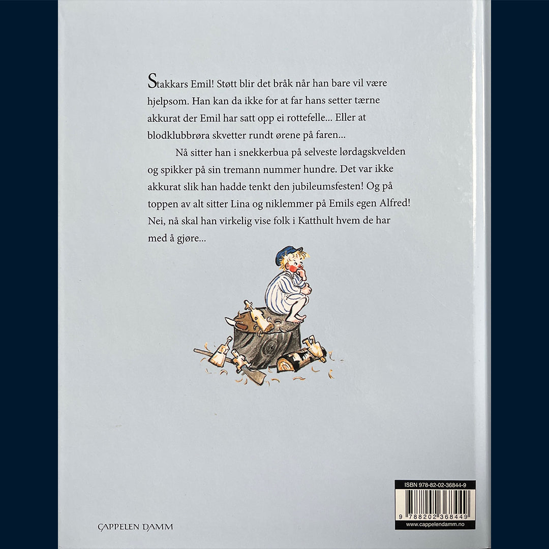 Nå sitter han i snekkerbua på selveste lørdags- kvelden og spikker på sin tremann nummer hundre. Det var ikke akkurat slik han hadde tenkt den jubileumsfesten! Og på toppen av alt sitter Lina og niklemmer på Emils egen Alfred! Nei, nå skal han virkelig vise folk i Katthult hvem de har med å gjøre...