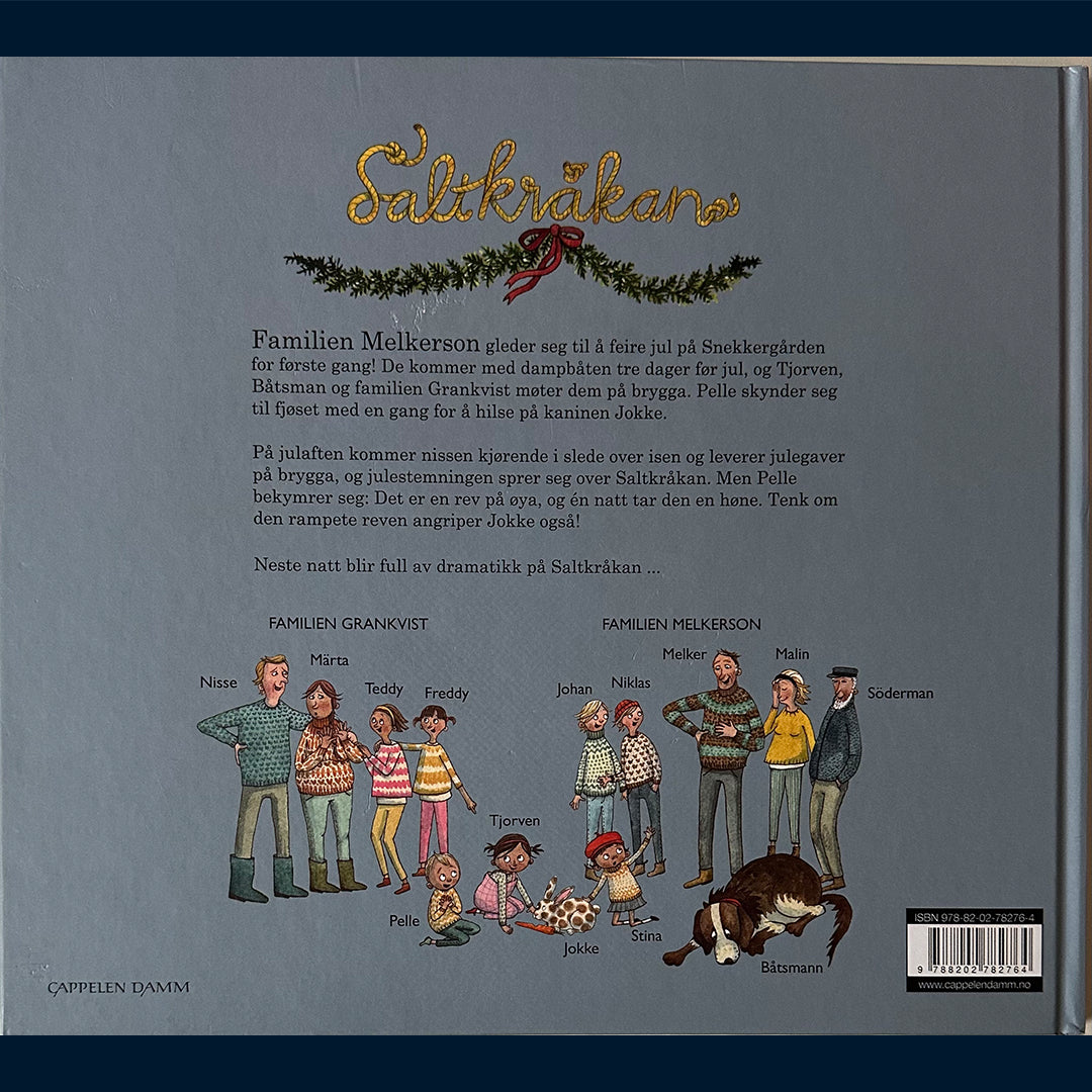 Familien Melkerson gleder seg til å feire jul på Snekkergården for første gang! Tjorven, Båtsman og familien Grankvist møter dem på bryggen. Pelle skynder seg til fjøset for å hilse på kaninen Jokke. På julaften kommer nissen kjørende i slede over isen og leverer julegaver på bryggen, og julestemningen sprer seg over Saltkråkan. Men Pelle får en bekymring: Det er en rev på øya, og én natt tar den en høne. Tenk om den rampete reven angriper Jokke også? Neste natt blir full av dramatikk på Saltkråkan ...