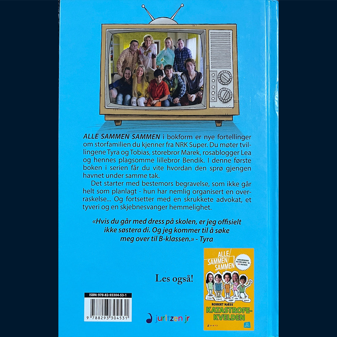 Alle sammen sammen i bokform er nye fortellinger om storfamilien du kjenner fra NRK Super. Du møter tvillingene Tyra og Tobias, storebror Marek, rosablogger Lea og hennes plagsomme lillebror Bendik. I denne første boken i serien får du vite hvordan den sprø gjengen havnet under samme tak