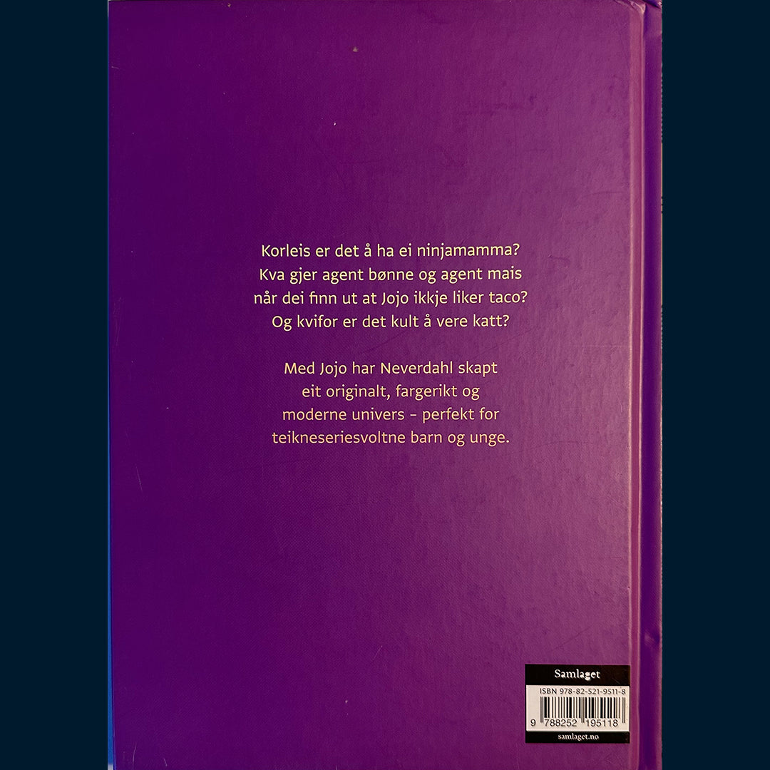 Morosam teikneserie for barn! Korleis er det å ha ei ninjamamma? Kva gjer agent bønne og agent mais når dei finn ut at Jojo ikkje liker taco? Og kvifor er det kult å vere katt? Med Jojo har Neverdahl skapt eit originalt, fargerikt og moderne univers - perfekt for teikneseriesvoltne barn og unge. Teikneseriestripene om Jojo er publiserte i Norsk Barneblad.