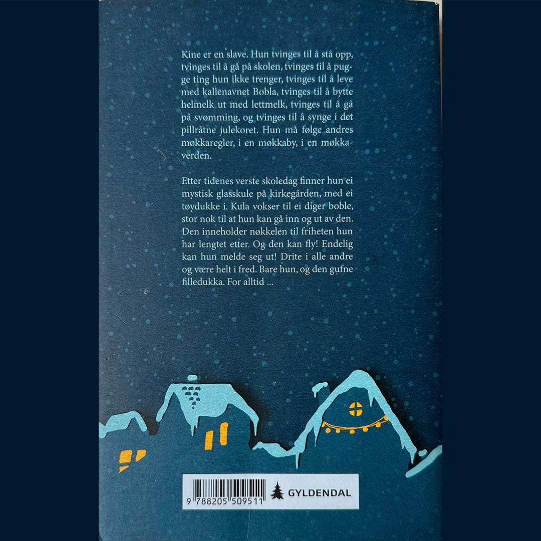 Etter tidenes verste skoledag finner hun ei mystisk glasskule på kirkegården, med ei tøydukke i. Kula vokser til ei diger boble, stor nok til at hun kan gå inn og ut av den. Den inneholder nøkkelen til friheten hun har lengtet etter. Og den kan fly! Endelig kan hun melde seg ut! Drite i alle andre og være helt i fred. Bare hun, og den gufne filledukka. For alltid ...