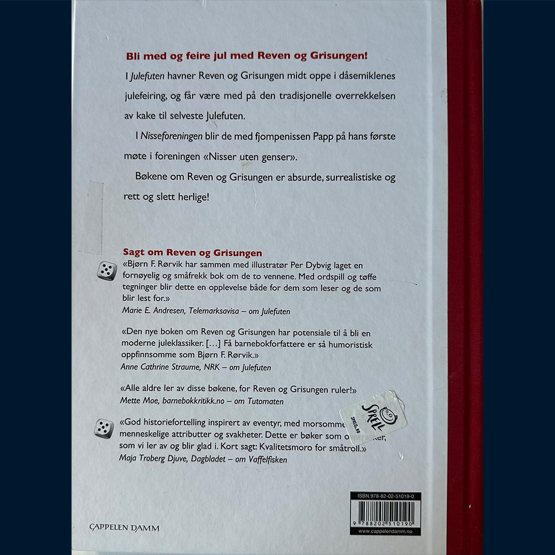 Bli med og feire jul med Reven og Grisungen! I Julefuten havner Reven og Grisungen midt oppe i dåsemiklenes julefeiring, og får være med på den tradisjonelle overrekkelsen av kake til selveste Julefuten. I Nisseforeningen blir de med fjompenissen Papp på hans første møte i foreningen «Nisser uten genser». Bøkene om Reven og Grisungen er absurde, surrealistiske og rett og slett herlige!