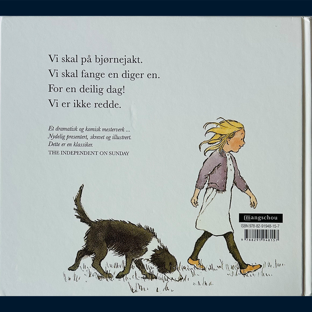 Det har aldri vært lett å dra på bjørnejakt, noe denne fortellingens håpefulle jegere snart skal finne ut. Det er en fin dag, og de er ikke redde! De forserer en eng med høyt gress, vasser over en dyp, kald elv, sliter seg gjennom gjørme, snubler gjennom en skog, kommer seg gjennom en snøstorm og lister seg på tå inn i en hule. Men her, i det skumle mørket, er alt helt annerledes ...