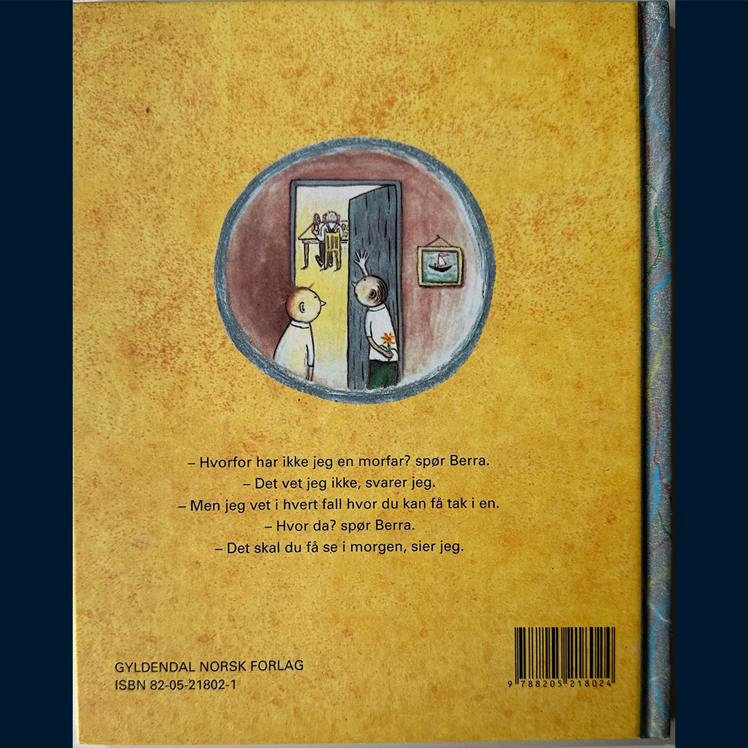 Hvorfor har jeg ikke en morfar? spør Berra. Det vet jeg ikke, svarer jeg. Men jeg vet i hvert fall hvor du kan få tak i en. Hvor da? spør Berra. Det skal du få se i morgen, sier jeg.