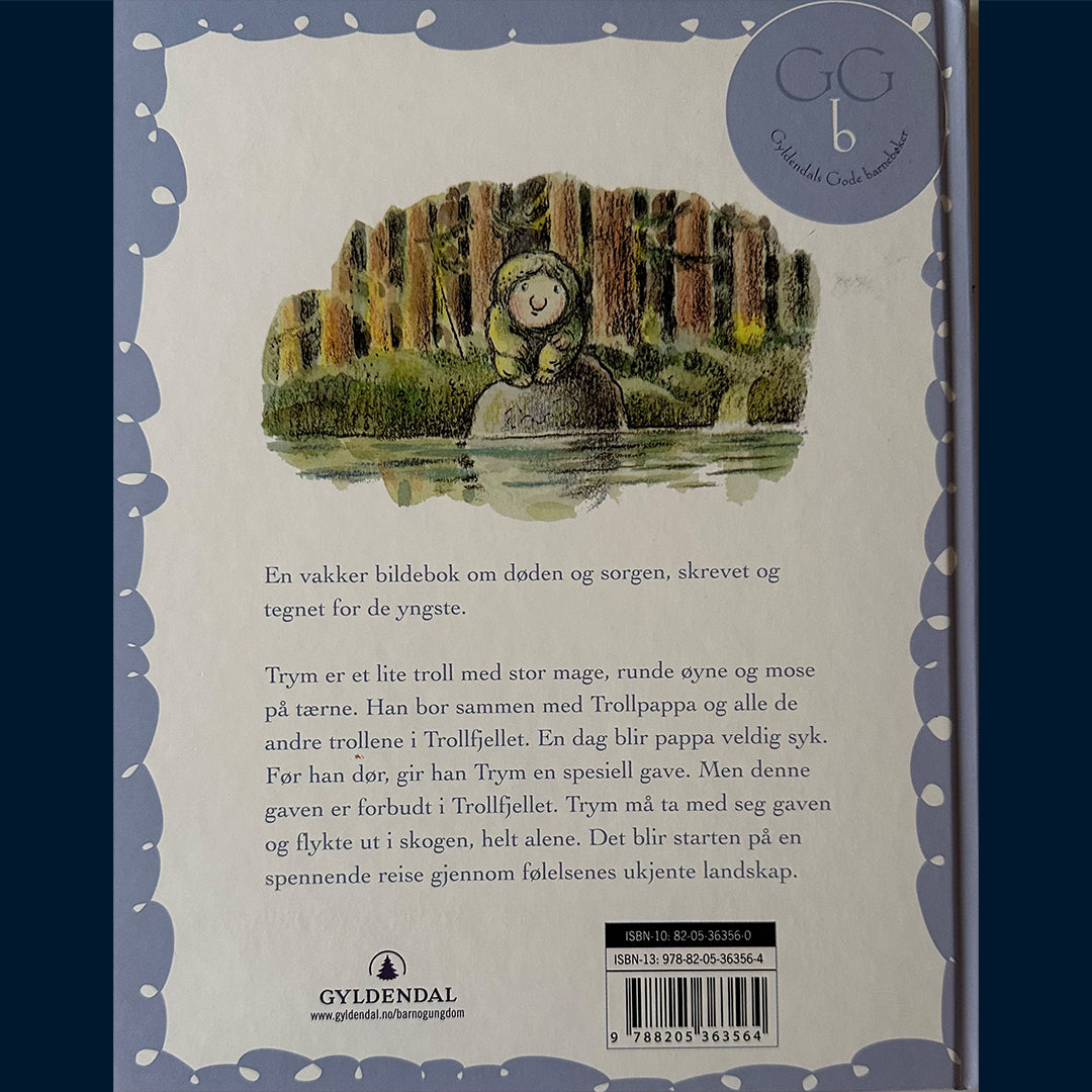 En vakker bildebok om døden og sorgen, skrevet og tegnet for de minste Trym er et lite troll med stor mage, runde øyne og mose på tærne. Han bor sammen med Trollpappa og alle de andre trollene i Trollfjellet. En dag blir Trollpappa veldig syk, og før han dør gir han Trym en helt spesiell gave. Men denne gaven er forbudt i Trollfjell. Selv om Trym gjemmer den så godt han kan, blir den oppdaget av Stortrollene, og Trym må flykte alene ut i skogen. Dette blir starten på en spennende reise gjennom følelsenes ukjente landskap.