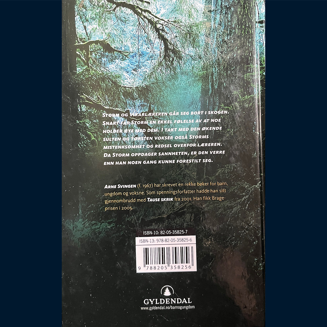Herlig spenning og uhygge fra populær forfatter Storm er på overnattingstur med den nye klassen da han og vikarlæreren går seg bort i skogen. Da de ikke finner tilbake, begynner Storm å mistenke at det er noe som ikke stemmer. Hvorfor leter ingen etter dem? I takt med den økende sulten og tørsten vokser Storms mistenksomhet og redsel. Dessuten er det noe der ute i mellom trærne .; noe som holder øye med dem. Hva er det egentlig som foregår?