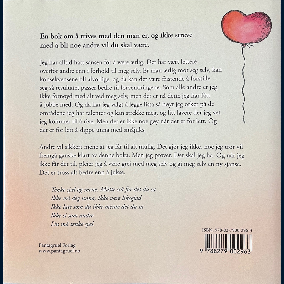 En bok om å trives med den man er, og ikke streve med å bli noe andre vil du skal være. Jeg har alltid hatt sansen for å være ærlig. Det har vært lettere overfor andre enn i forhold til meg selv. Er man ærlig mot seg selv, kan konsekvensene bli alvorlige, og da kan det være fristende å forestille seg så resultatet passer bedre til forventningene.