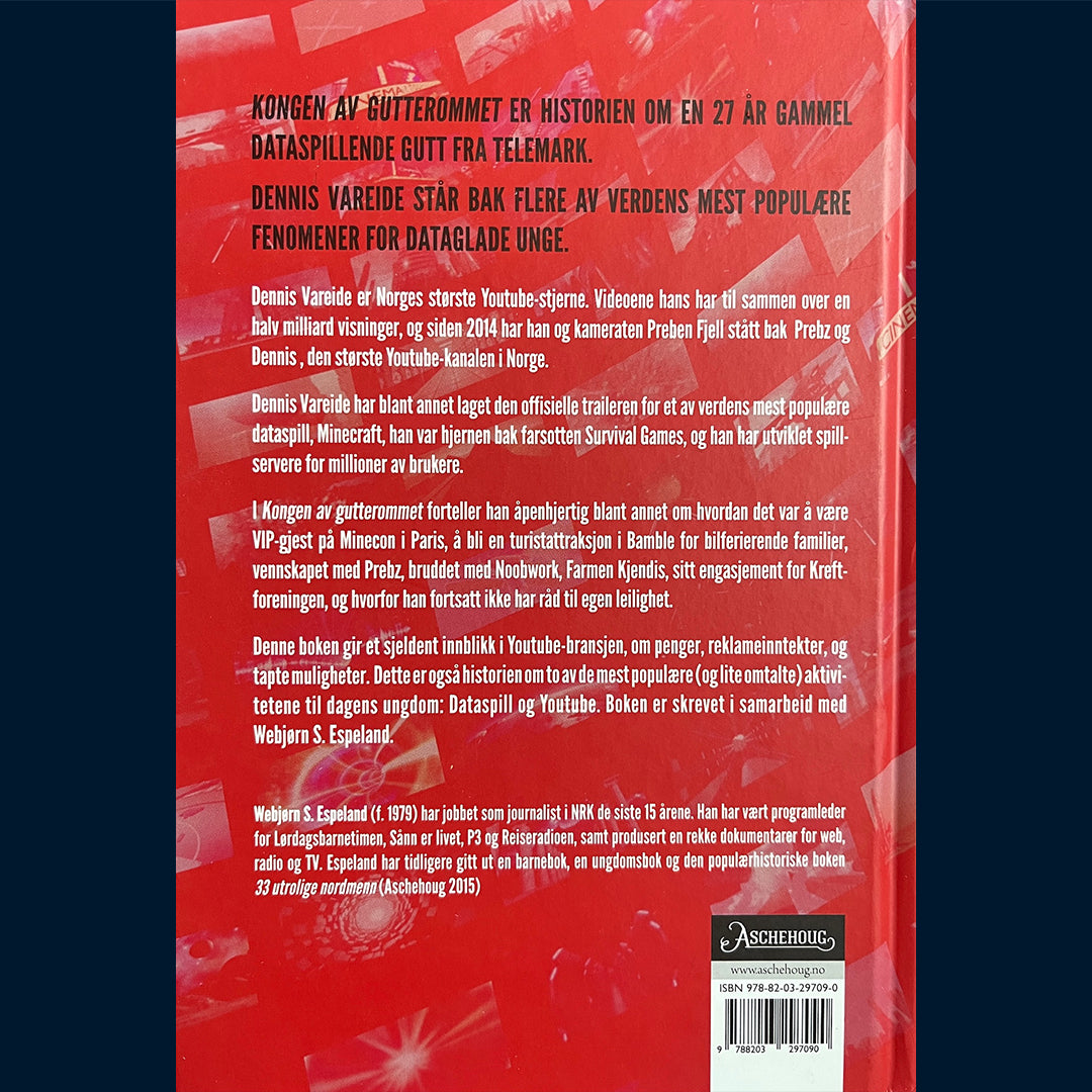 I «Kongen av gutterommet» forteller han åpenhjertig blant annet om hvordan det var å være VIP-gjest på Minecon i Paris, å bli en turistattraksjon i Bamble for bilferierende familier, vennskapet med Prebz, bruddet med Noobwork, Farmen Kjendis, sitt eget engasjement for Kreftforeningen, og hvorfor han fortsatt ikke har råd til egen leilighet. Denne boken gir et sjeldent innblikk i Youtube-bransjen, om penger, reklameinntekter, og tapte muligheter. Dette er også historien om to av de mest populære (og lite omtalte) aktivitetene til dagens ungdom: Dataspill og Youtube. Boken er ført i pennen av journalist Webjørn S. Espeland.
