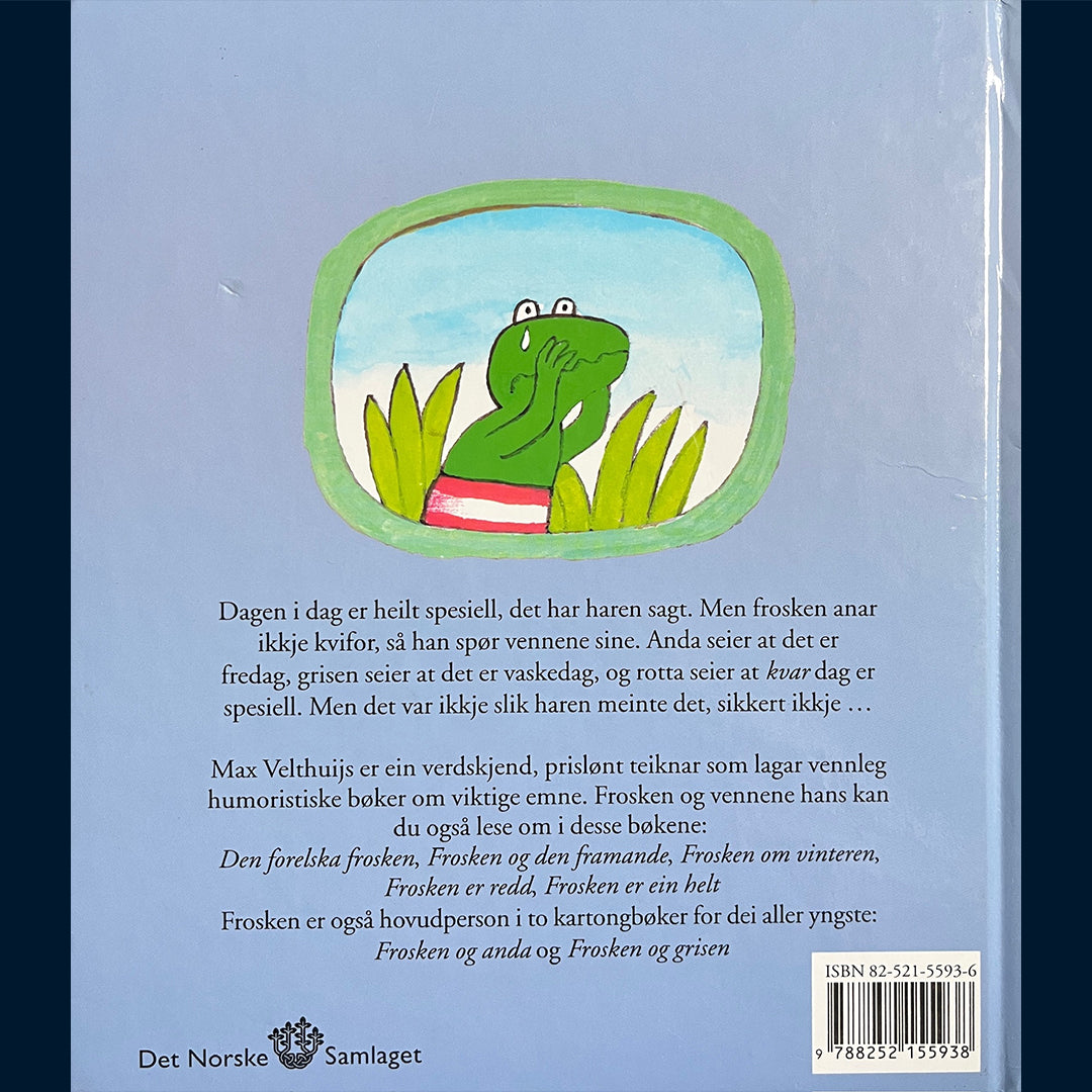 Dagen i dag er helt spesiell, det har haren sagt. Men frosken anar ikkje kvifor, så han spør vennene sine. Anda seier at det er fredag, grisen seier at det er vaskedag, og rotta seier at kvar dag er spesiell. Men det var ikkje slik haren meinte det, sikkert ikkje .