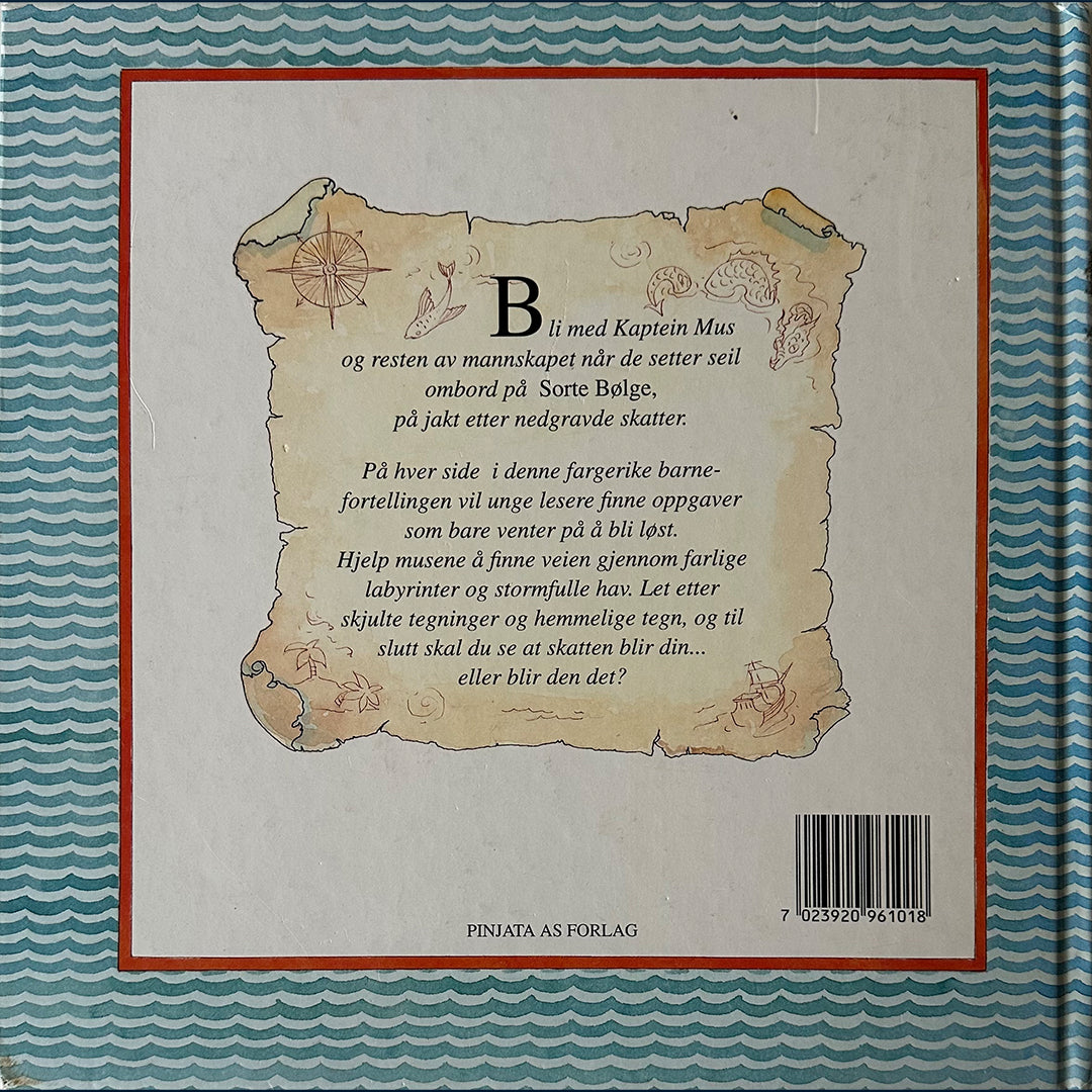 I denne boka følger vi Kaptein Mus og resten av mannskapet når de setter seil ombord på Sorte Bølge, på jakt etter nedgravde skatter. På hver side i fortellingen er det en oppgave som du kan løse. Du kan hjelpe musene å finne veien gjennom labyrinter og stormfulle hav, lete etter skjulte tegninger, hemmelige tegn m.m.
